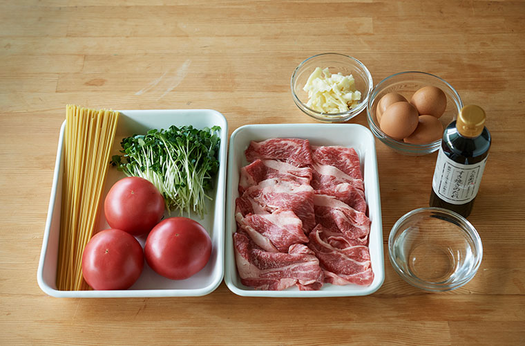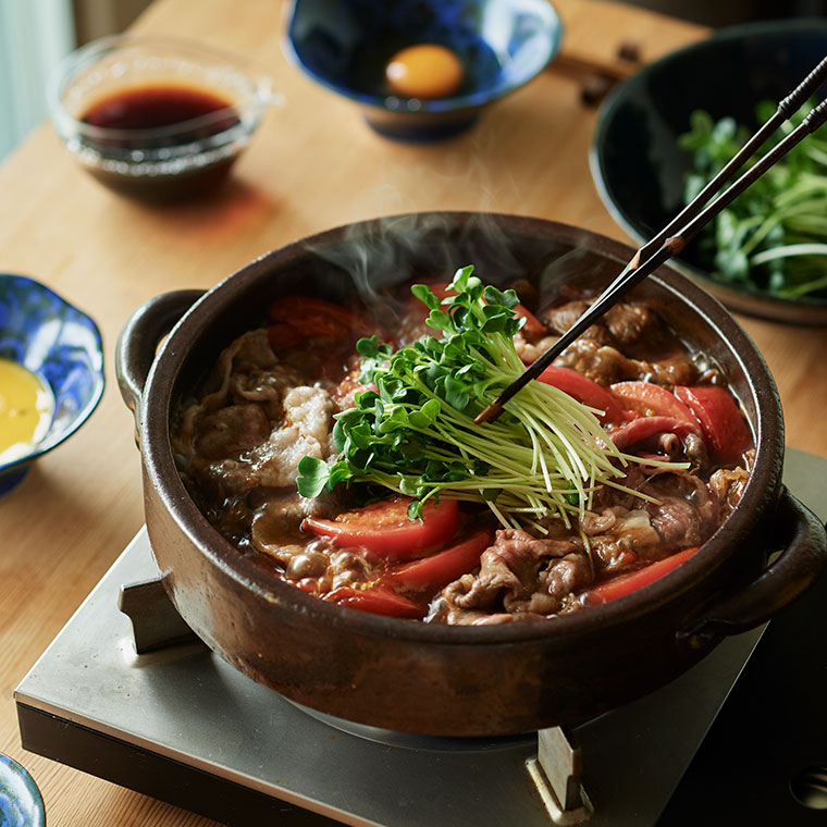 醤油と相性の良いトマトを組み合わせた夏のすき焼きは、トマトの旨味と酸味で、お箸がすすむ味わいです。野菜は貝割れ菜以外に、クレソンやお好みの青菜を使っても美味しくいただけます。〆のパスタまで準備も調理も簡単にできる上、暑い夏に打ち勝つ栄養もたっぷりと摂れるので、今の時期にこそ楽しんでいただきたい一品です。