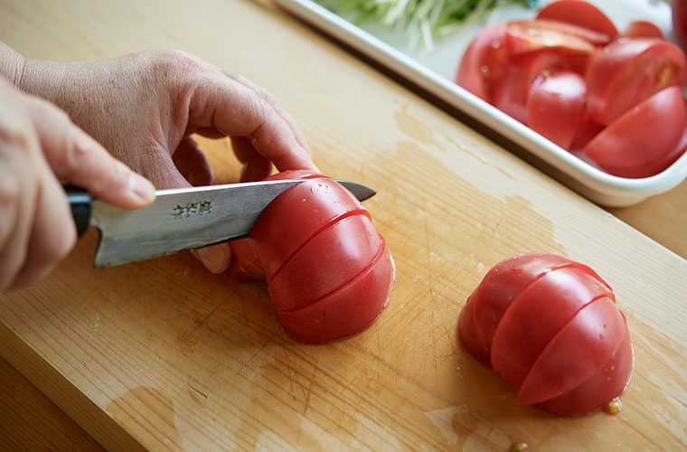 ③ トマトは2㎝厚さ程度のくし切りにする。貝割れ菜は根を外す。