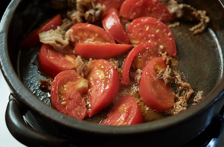 最初のトマトに焼き目がつくまで焼くのがポイントです。割り下にトマトの旨味と酸味、焼いた香味が溶け込み、味わいが格段にアップします。