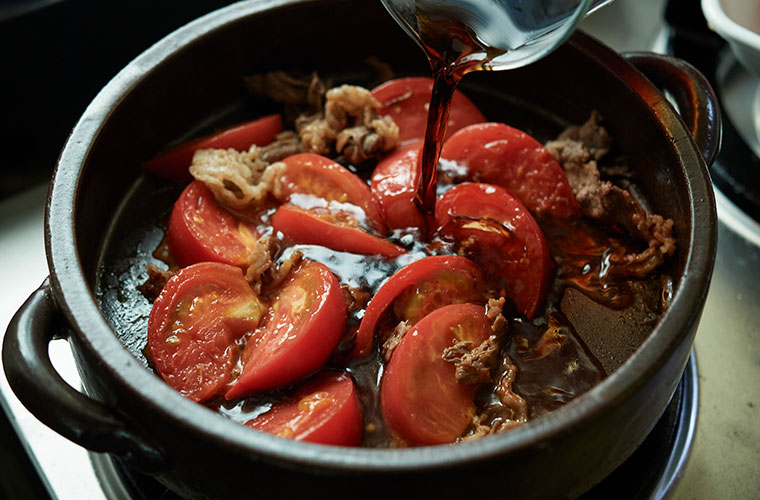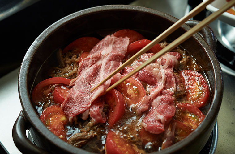 ⑩ 鍋の中の煮汁が少なくなったら割り下を足し、適宜具材を加えて火を通しながらいただく。〆に使うため、鍋の中のトマトと牛肉を少し残しておく。