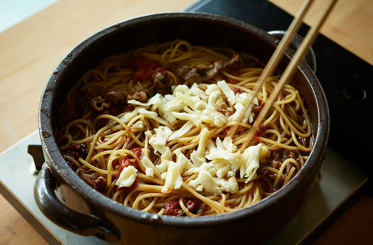 • ⑪ 〆にトマトチーズパスタを作る。残った煮汁に②のパスタを加えて煮込む。煮汁が少なくなったらミックスチーズを加え、からめていただく。