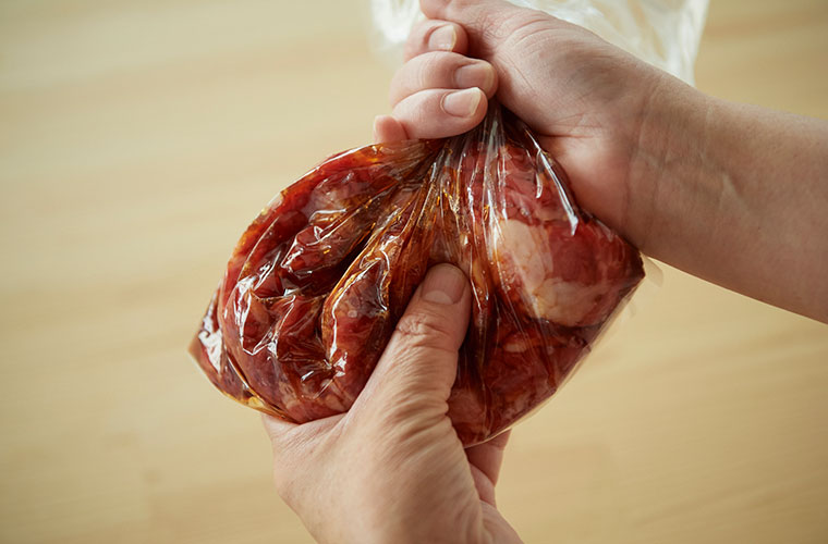 ② ビニール袋の口を閉じ、よく揉みこむ。