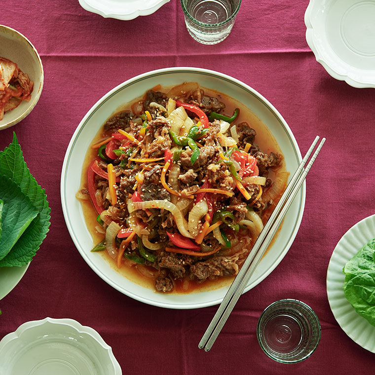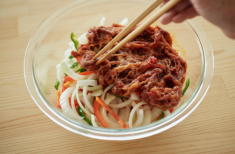 甘辛いたれの香ばしさとジューシーな牛肉、シャキシャキ野菜が絶妙に調和した韓国を代表する肉料理のプルコギ。焼肉のたれを使って、レンジで簡単に作ったとは思えないほど、本格的な味わいです。手早く作れて見た目も鮮やかですので、おもてなしの一品としてもおすすめです。