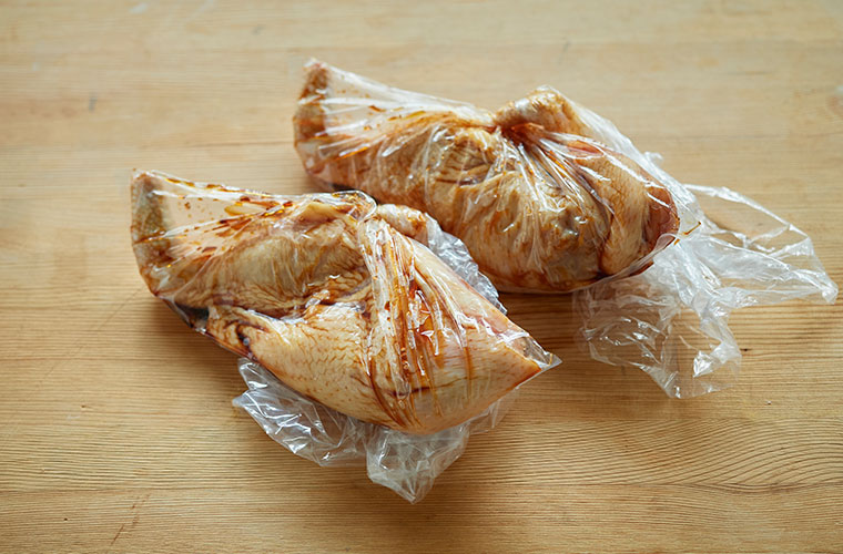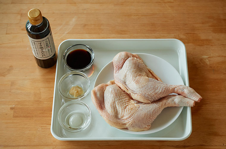 ③ 厚手のビニール袋に、②の骨付き鶏もも肉を入れ、分量のすき焼きのたれを半量ずつ加えてよく揉み込む。