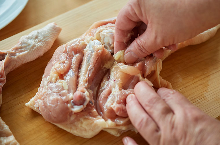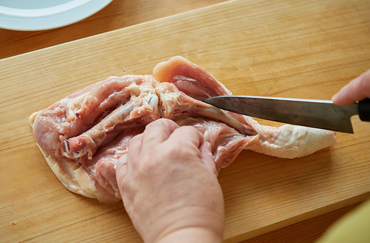 ① 骨付き鶏もも肉は骨に沿って切り込みを入れる。