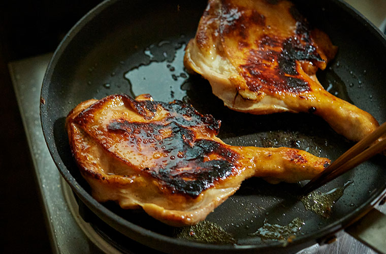 鶏もも肉のように厚みがある肉を焼く時は、肉自体を常温に戻しておくことと、火加減を強くしないことがポイントです。弱火でじっくりと焼くことでふっくらとジューシーに仕上がり、中心部まできちんと火が通ります。