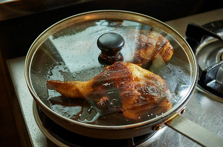 ⑤ 蓋ができる大きめのフライパンにサラダ油を入れ、④の肉の皮面を下にして、弱めの中火にかける。