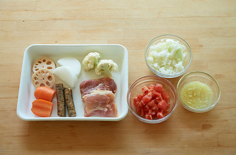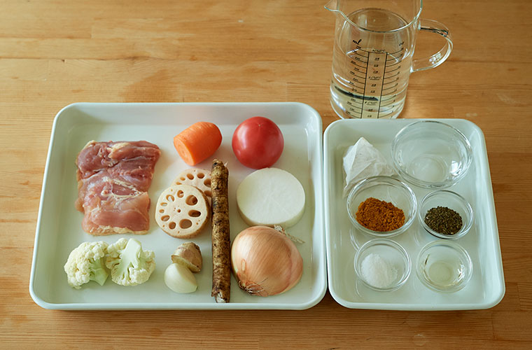 ③ 鶏もも肉は2等分にし、分量の塩(小さじ1/4)をふって下味をつけておく。人参は2等分、大根は皮をむいて2等分、れんこんは皮つきのままよく洗う。ごぼうは表面の泥を落として長さを2等分にする。