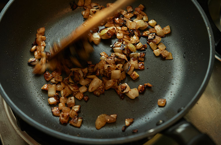 ④ カレーベースを作る。フライパンにサラダ油小さじ2を熱し、①の玉ねぎを中火で炒める。きつね色になってきたら弱火にし、周りがこんがりと茶褐色になるまでじっくりと炒める。