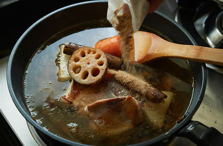 ⑨ カレーベース、具材の入った⑦のフライパンに、⑧の水分を全て加え、久右衛門だしパックを破って加える。沸騰したら弱火にして30分煮込み、乾燥バジルを加えて火を止める。