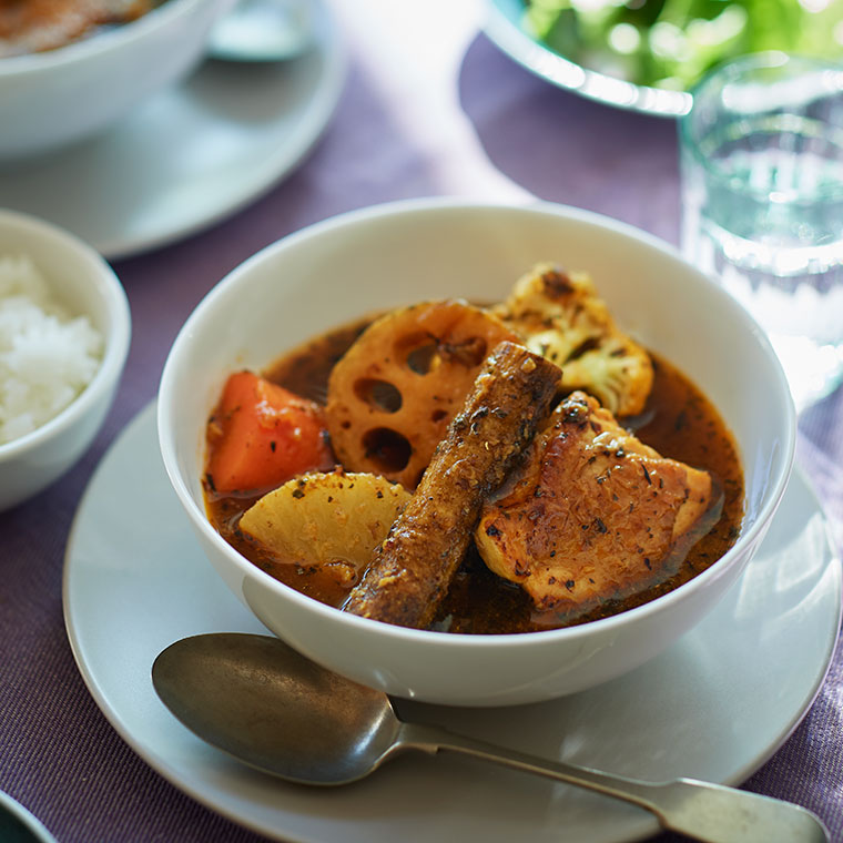 札幌で誕生したスープカレー。本場のレシピは本格的なスパイスを使用しますが、久右衛門だしとカレー粉でご自宅で本格的な味わいが楽しめるようにアレンジしております。体の芯から温めて、たっぷりの具材で満足感のあるスープカレーは寒い日におすすめの一品です。お正月のおせちで作った筑前煮を具材として用いても美味しくなります。