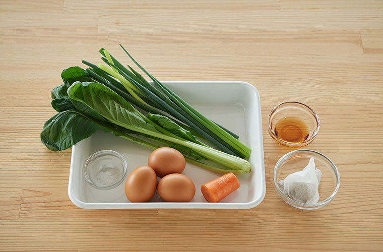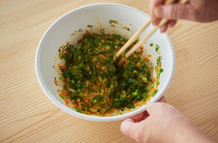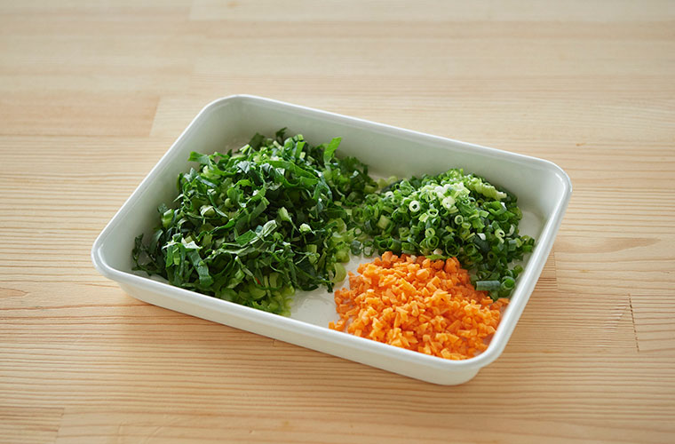 ① 小松菜は根元をよく洗い、2~3mm幅の小口切りにする。人参はみじん切り、小ねぎは小口切りにする。