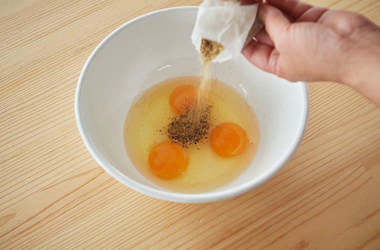 ② ボウルに卵を割り入れ、塩、久右衛門あごだしパックの袋を破って加え、よく混ぜる。