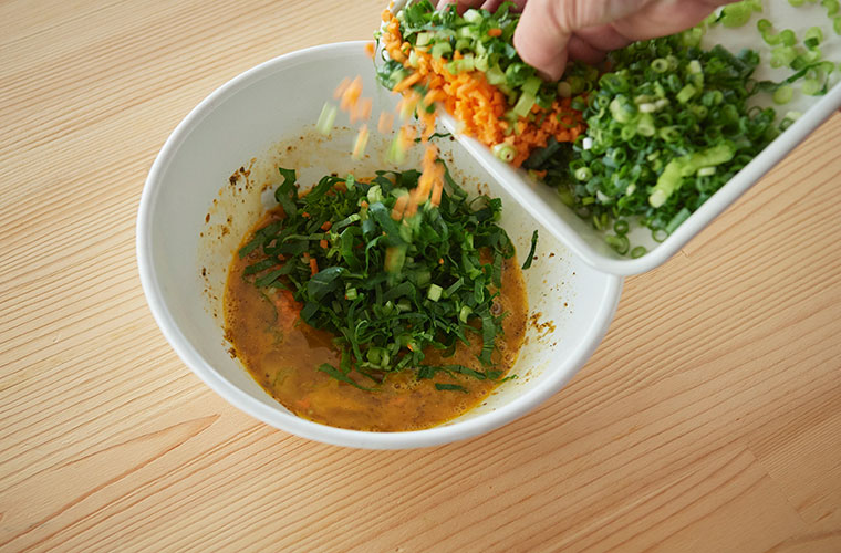 ④ 野菜が卵液全体にまんべんなく行きわたるよう、よく混ぜ合わせる。