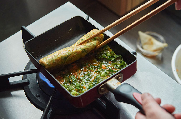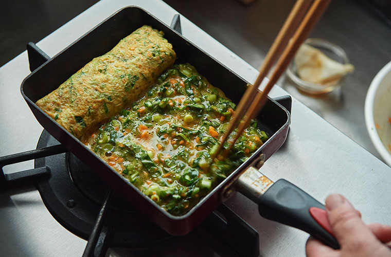 具材が卵液に沈みやすいので、焼く度に卵液をよく混ぜてから卵焼き器に流すようにしましょう。火加減は弱めの中火にして中までしっかりと火を通し、卵液は少な目に流して何度も焼き重ねると上手に焼けます。