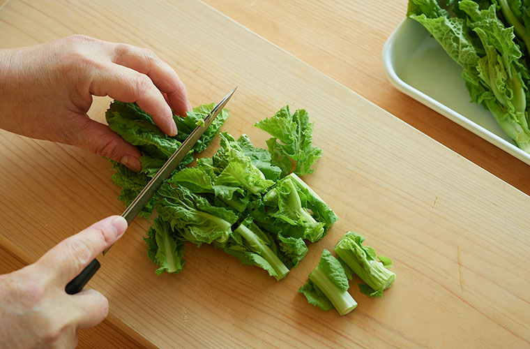 ④ フライパンに分量のオリーブオイル、①のにんにくと赤唐辛子を入れて弱火にかけ、香りが出てきたら②の菜の花を加えて炒める。