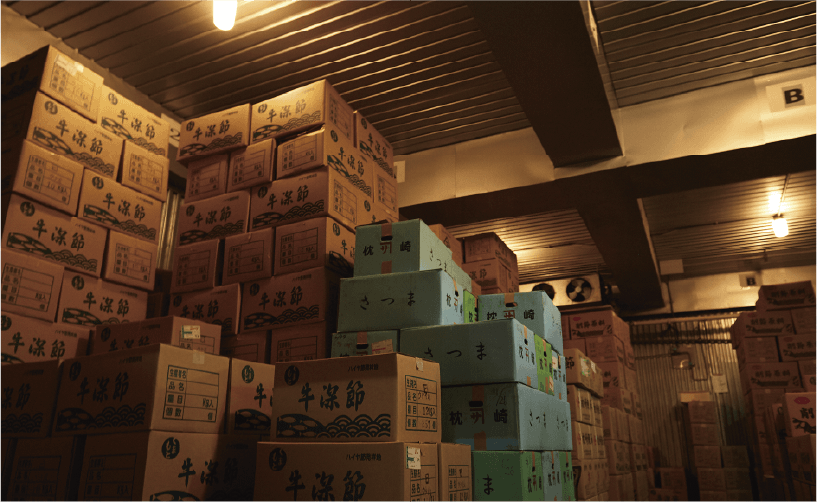 上質な原料を厳選して調達するために、取り寄せた見本を吟味し、官能検査やその他の品質検査をクリアした節のみを買い付けしております。また、社内に大型冷蔵庫を完備しており、安定供給のためにしっかりと在庫を保管しております。